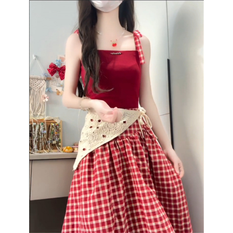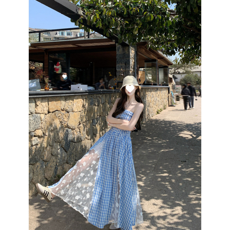 デザインヘビーデューティーレーススプライシングチェック柄サスペンダードレス 2025 夏の新スリム A ラインロングスカート女性のための