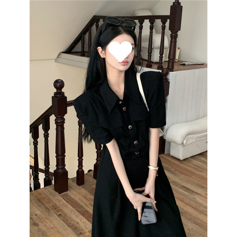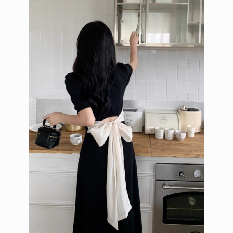 フランス式の黒いワンピースの女性2025夏の新型は腰を収めて透かしを透かしてデザイン感があります。