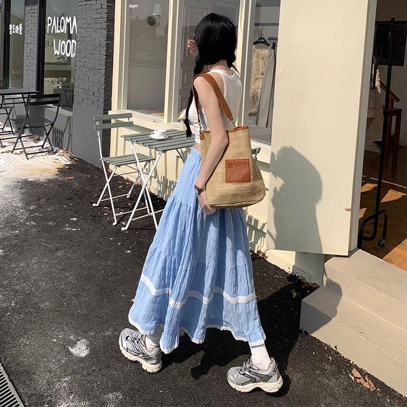 女性のためのハイエンドブルーレーススプライシングケーキスカート 2024 春夏新韓国スタイルハイウエストスリム A ラインスカートロングスカート