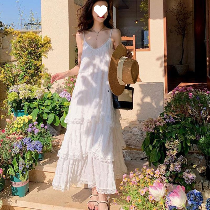 フレンチホワイトフェアリースカートサスペンダースカート海辺の休暇ドレス女性のスリムサマースカートニッチ気質ロングスカート