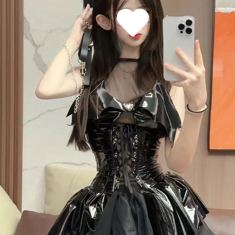 服セクシーなパテントレザー小悪魔cos女性服ロリータロリータサキュバスジャンプスーツショートドレスメイラードブラック