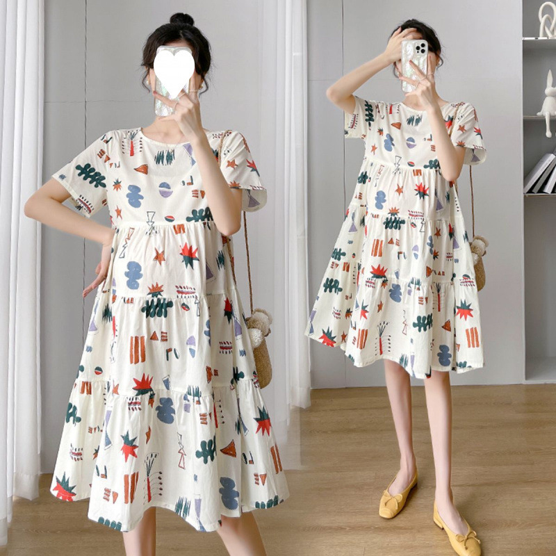 カラフルなマタニティドレス、夏スタイル、ゆったりとした大きいサイズのアウターマタニティドレス、スタイリッシュでエレガントでファッショナブルなプリントスカート、快適