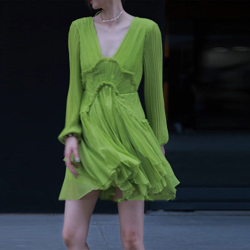 ティーブレイクフレンチスタイル美しいロマンチックなレトロなハイエンドの服装ハイエンドのロイヤルシスタースタイルのグリーンドレス女性の秋