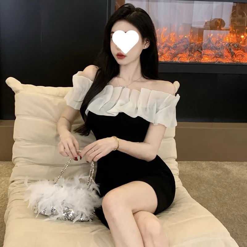 フレンチスタイルのフリルステッチワンラインカラーオフショルダーセクシーショートスカートブラックスリムファッショナブルなリトルブラックドレス女性用