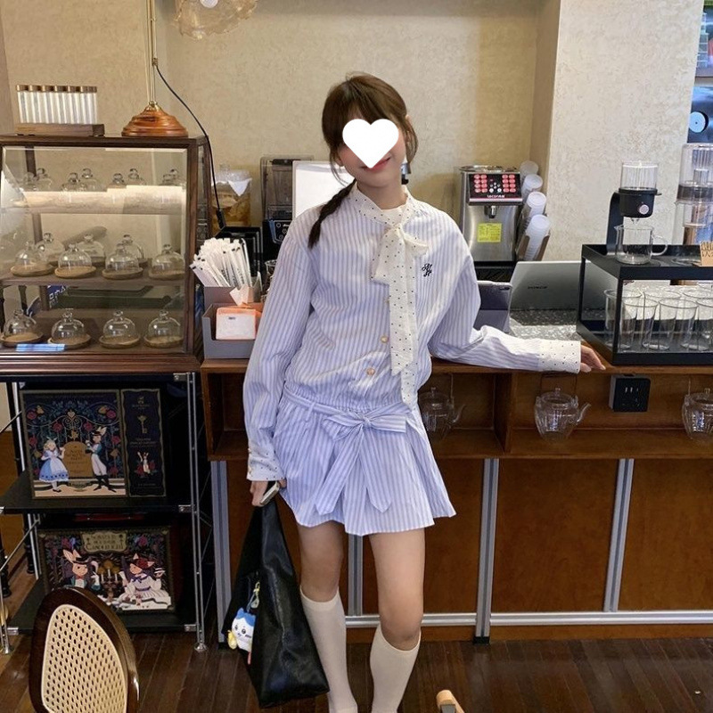 リボンストライプ刺繍長袖ドレス女性のための 2025 夏の新デザインウエスト痩身 A ラインスカート