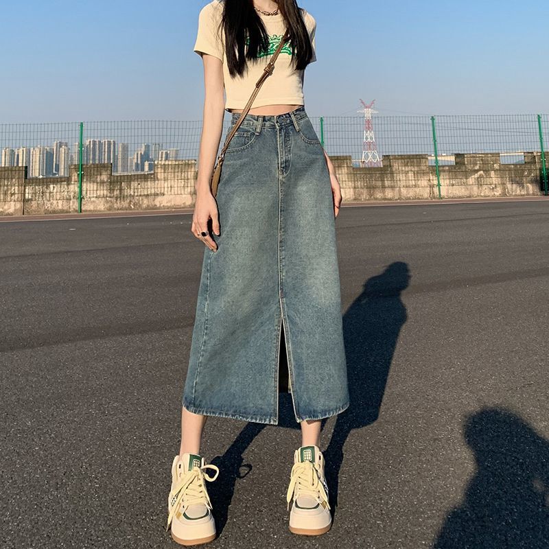 女性のためのハイウエストスリットデニムスカート春と秋2025新しいストレートペアシェイプスリムミッドレングスAラインヒップスカート