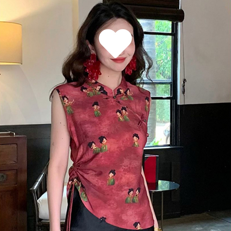 2025 夏の新スタイル中国風斜めボタンノースリーブトップ女性のプリントデザインプリーツベスト T シャツ気質