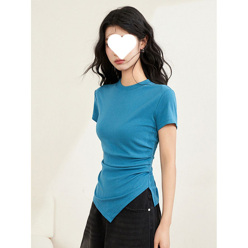 2025 新しい夏の黒のスリム T シャツ女性の不規則な裾デザイン底半袖トップ無地