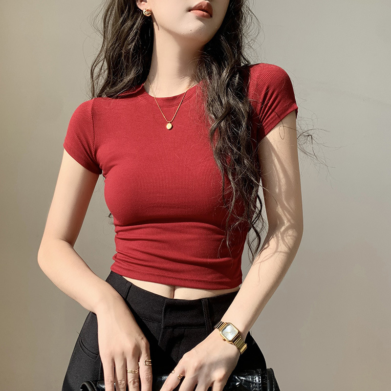 ショート Tシャツ レディース 右肩半袖 2025 夏新作 スレッド ラウンドネック Tシャツ レッド タイトトップで体型を美しく見せます