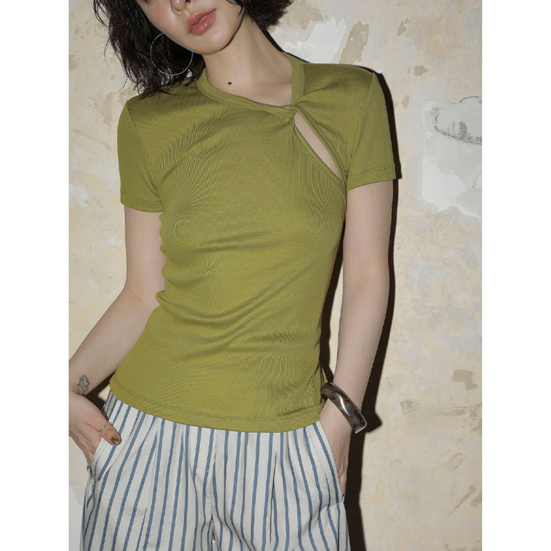 2025年新作夏スタイルツイスト中空デザインスリットスリムフィット右肩半袖Tシャツスリムトップフェミニン