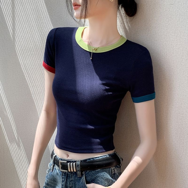 コントラストカラーステッチラウンドネック半袖Tシャツ女性用2025夏新作ホットガールハイウエストスリムフィットへそ露出ショルダートップ