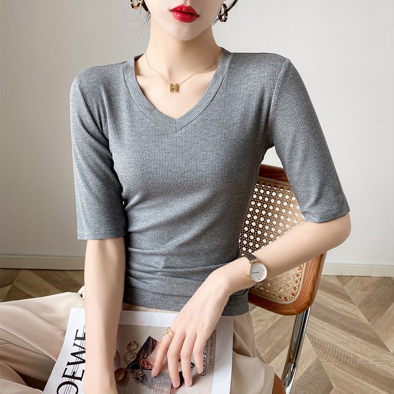 ニップルグレーvネック中袖tシャツレディース新作春インナースリム五分袖ボトムスシック着痩せトップス