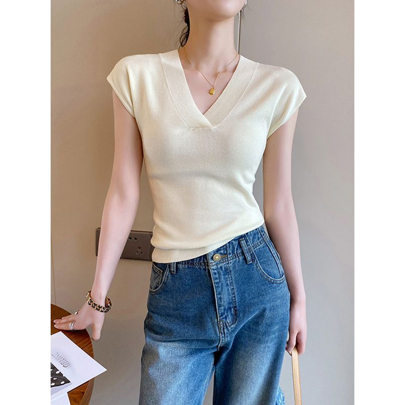フレンチ V ネックニット Tシャツレディース 2025 春夏新作半袖カジュアルスリムトップ無地ハイエンド
