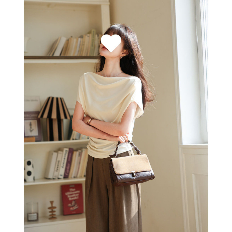 2025 夏フレンチスタイル斜め肩スイングカラーフライングスリーブ高弾性快適なカバー女性 Tシャツ無地ハイエンド