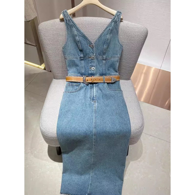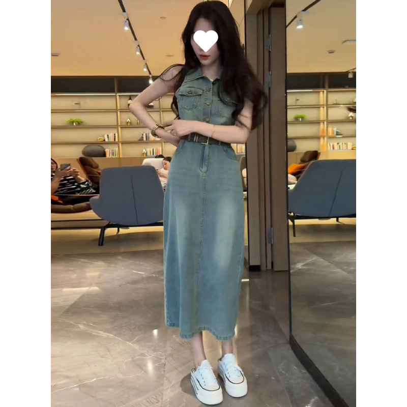 ファッショナブルでシックなデニムスカート 2025 夏の新デザインスリムシングルブレスト V ネックノースリーブロイヤルシスタードレス