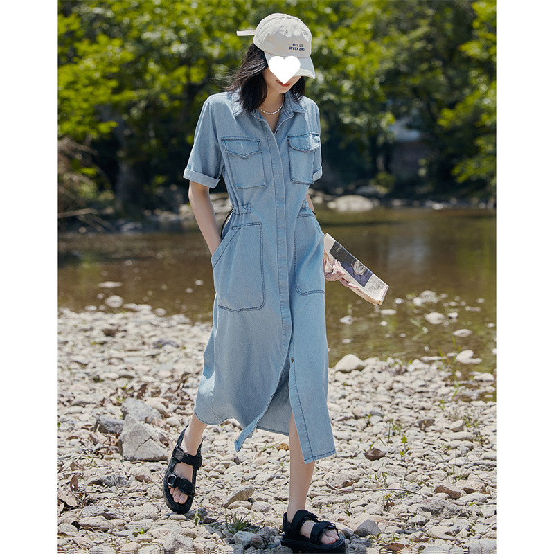 2025立体工装ポケットロングポロスカート夏女性ウエストデザイン半袖デニムワンピース高級感