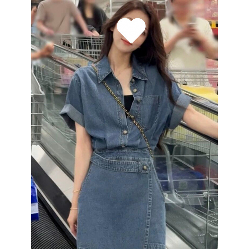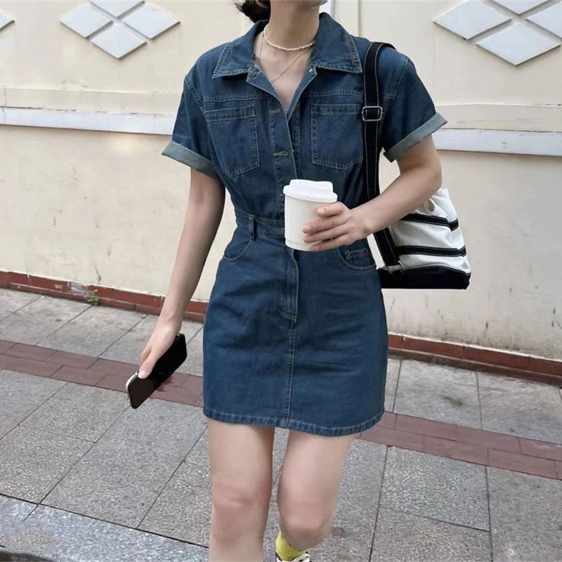 韓国版レトロポロカラーデニムドレスレディース夏ウエスト痩身ショートスカート不規則なAラインスカート