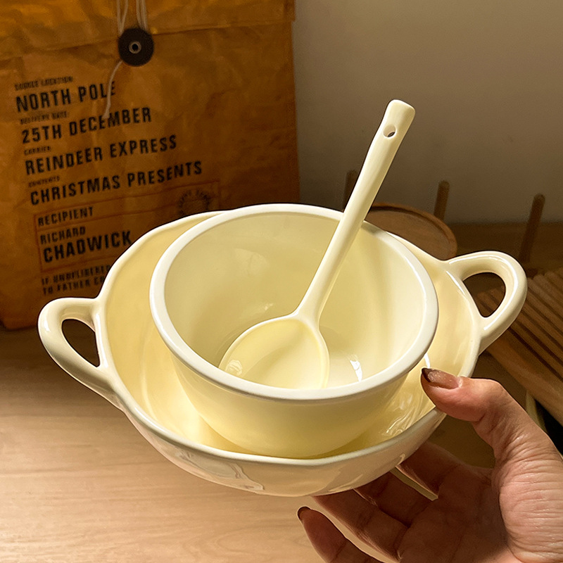 クリームins风セラミック碗皿食器セット不规则双耳碗釉下彩家庭用高颜値碗皿スプーン