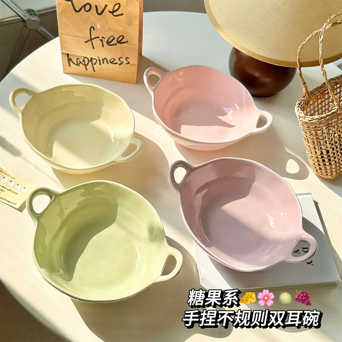 Wzrins色釉薬異形双耳碗家庭用焼き碗クリーム風日本式高顔値麺碗サラダ碗果物碗