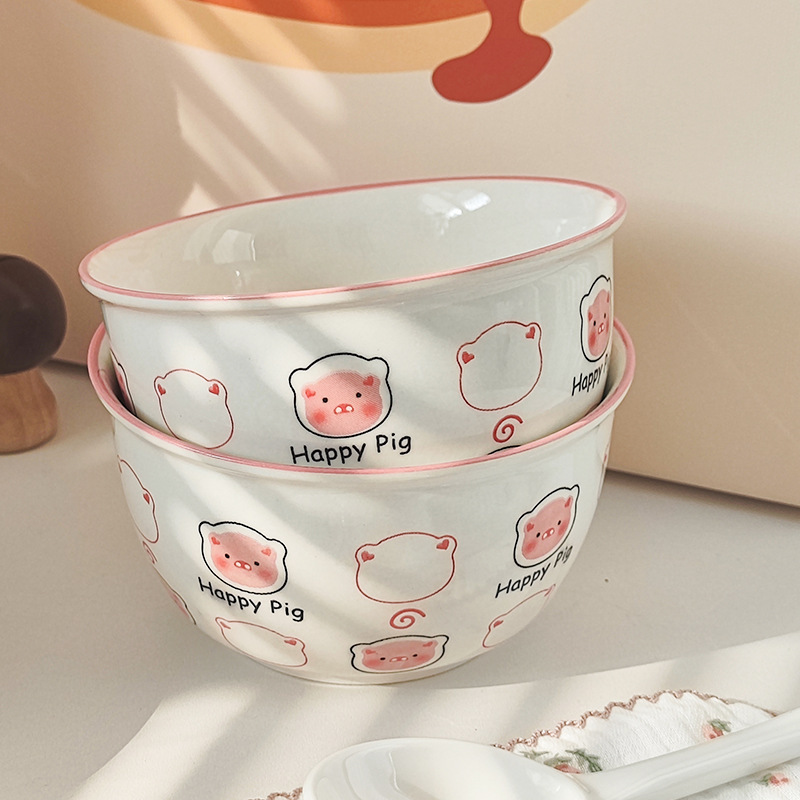 クリーム風子豚子犬セラミックボウルスプーンかわいい少女心飯碗ins風家庭用釉薬下彩碗スプーンセット