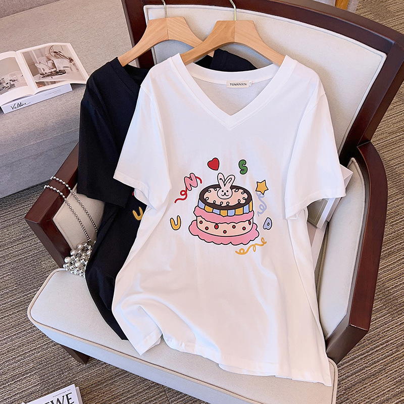 Vネックの新型加肥プラスサイズはやせてゆったりした中長の半袖tシャツの女性200/300/350斤6368