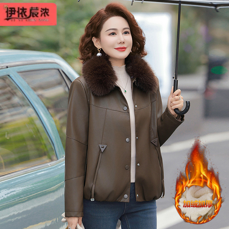革のコートの女性にベルベットをつけて、2024秋冬の新しい中年の女性の母親の40歳から50歳までのファッションの短いPU綿の服を厚くします