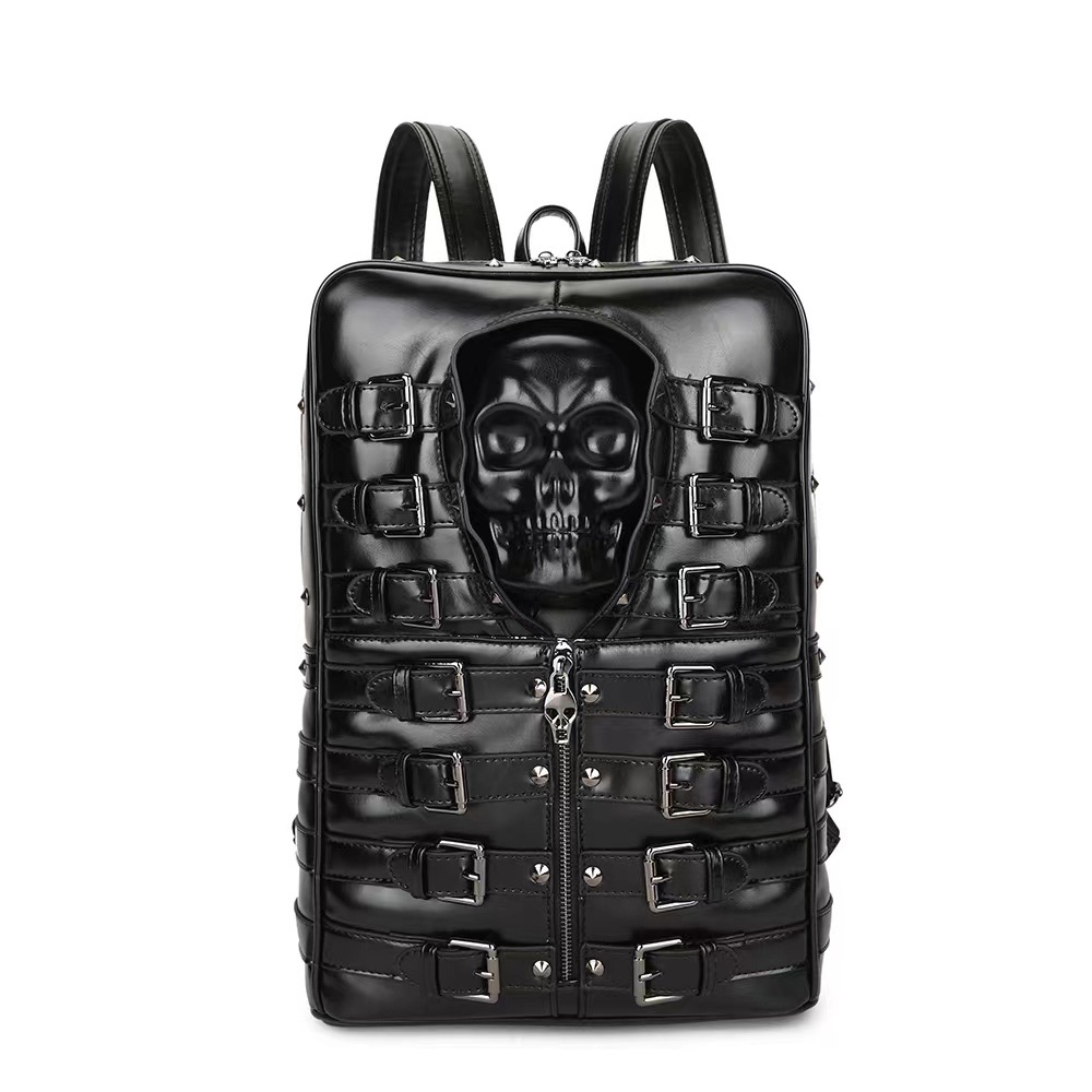 クロスボーダークールパンクスタイルブラックバックパックエンボススカルバッグリベットバッグ大容量バックパックユニセックス