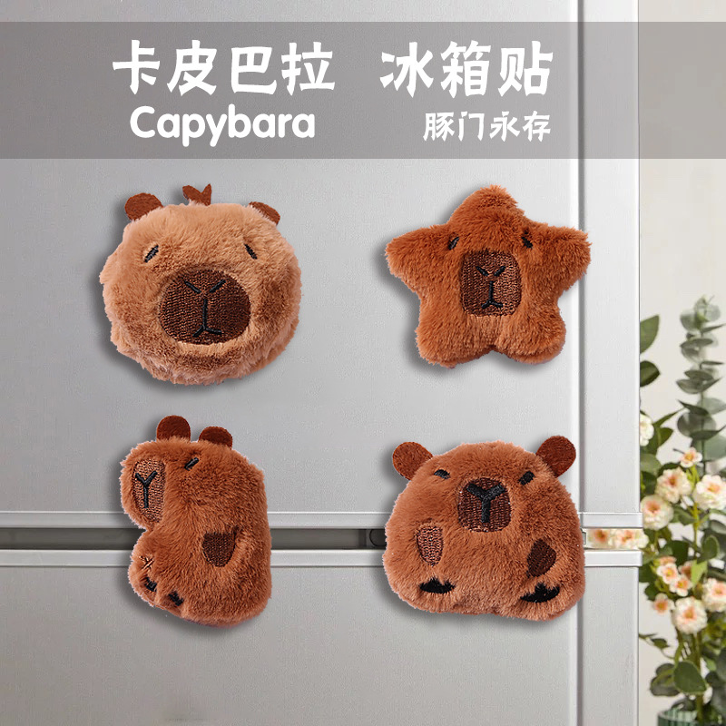 カピバラの冷蔵庫に可愛いぬいぐるみのカピバラの磁気シールの装飾品が貼られています。