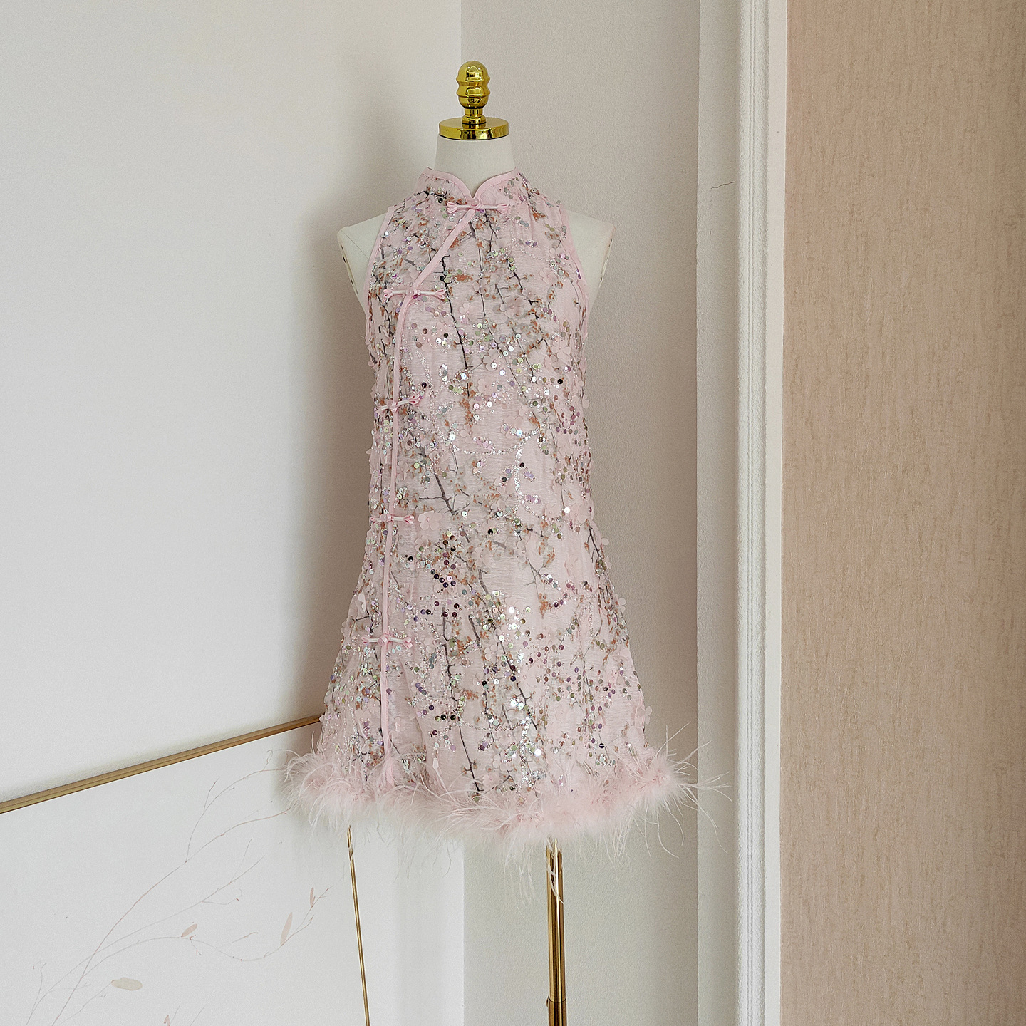2025 新製品新中国風スパンコール刺繍ビーズ立体花羽ステッチチャイナドレスノースリーブドレス