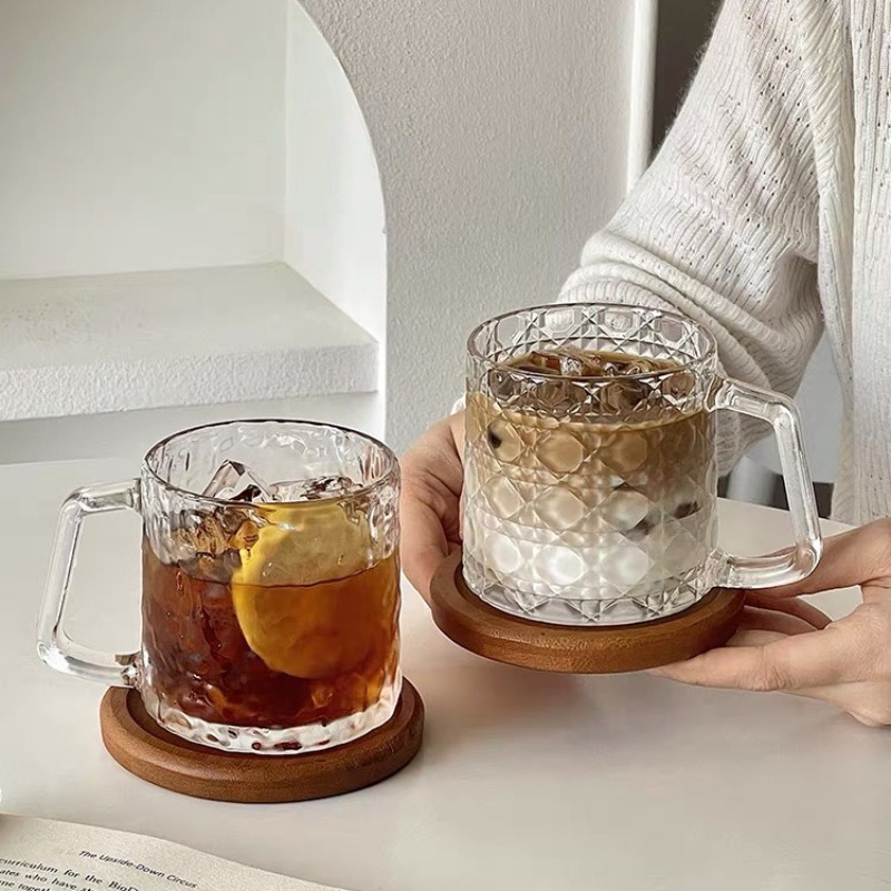 彫刻が施されたハンドル付きガラスカップ、家庭用クリエイティブで見栄えの良い女の子用透明飲料水アイスコーヒーカップマグカップ