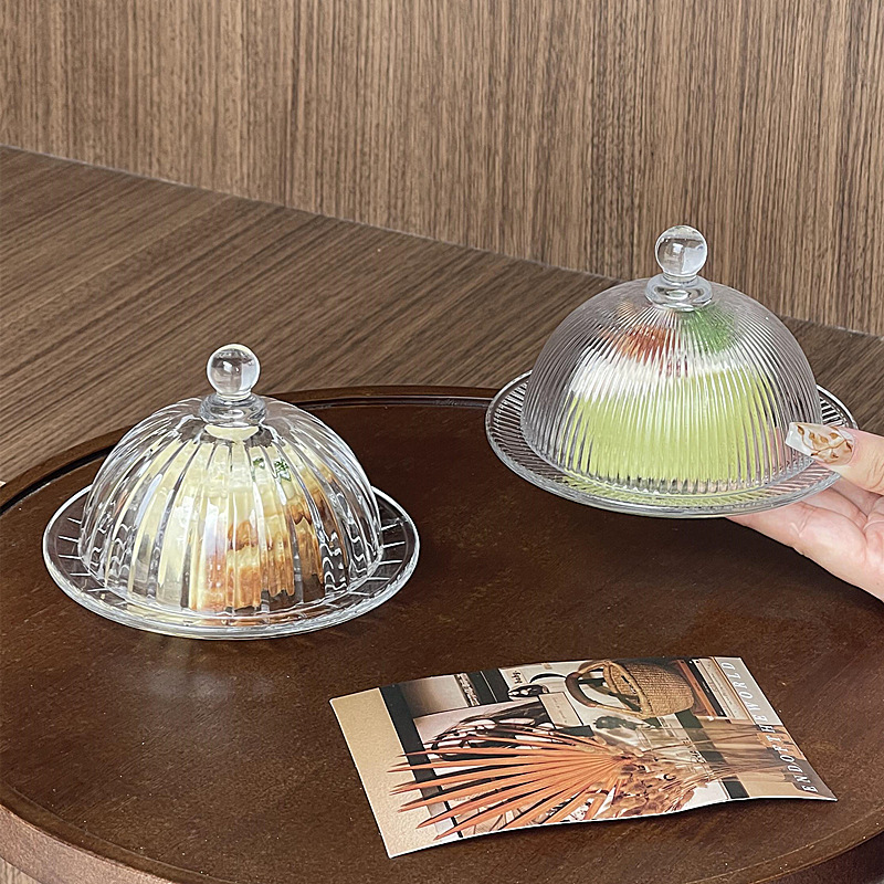 日本式insストライプデザート皿セット透明ガラス蓋付きケーキカバー果物菓子展示台軽食カバー