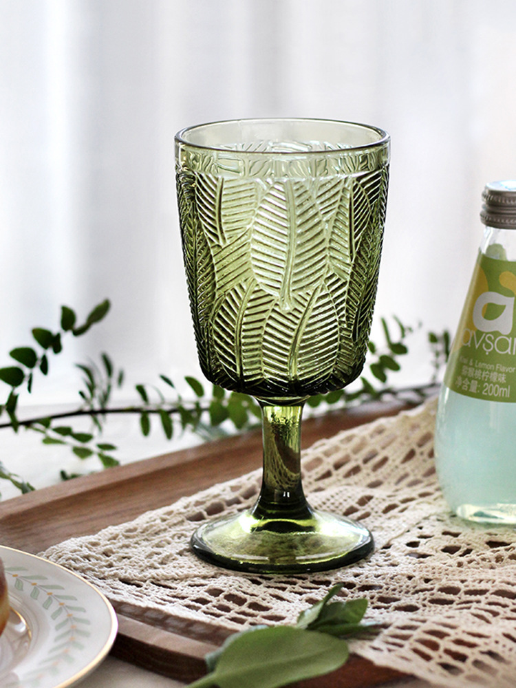 レトロヴィンテージグリーンリーフレリーフ高脚ワイングラス家庭用コップ宴会グラスジュース朝食カップ