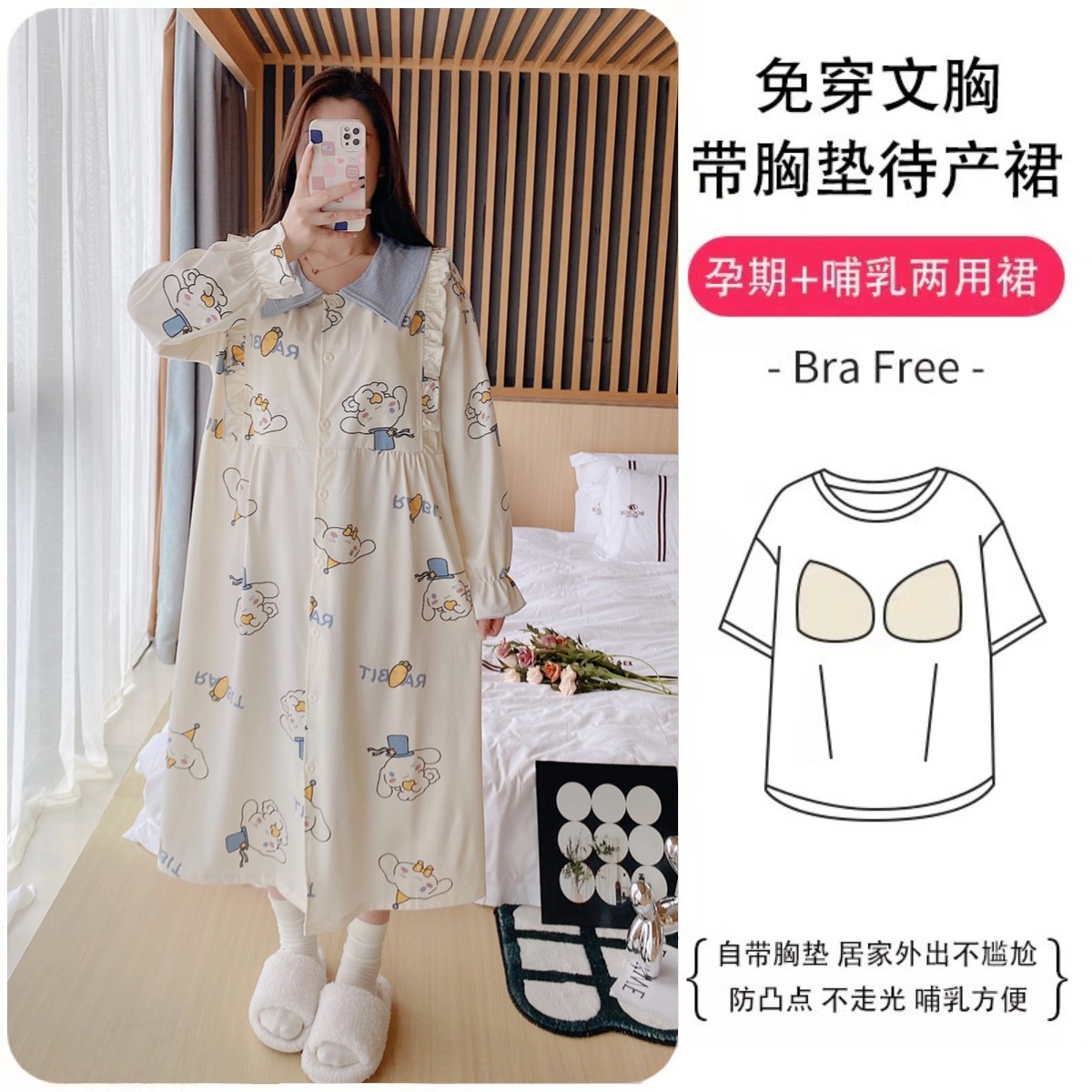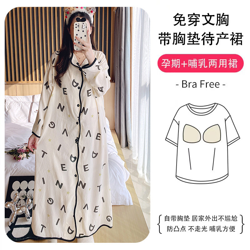 2024模造綿春夏5薄手胸当て付きロングスカート月子服ワンピース出産前産後妊婦授乳パジャマ6