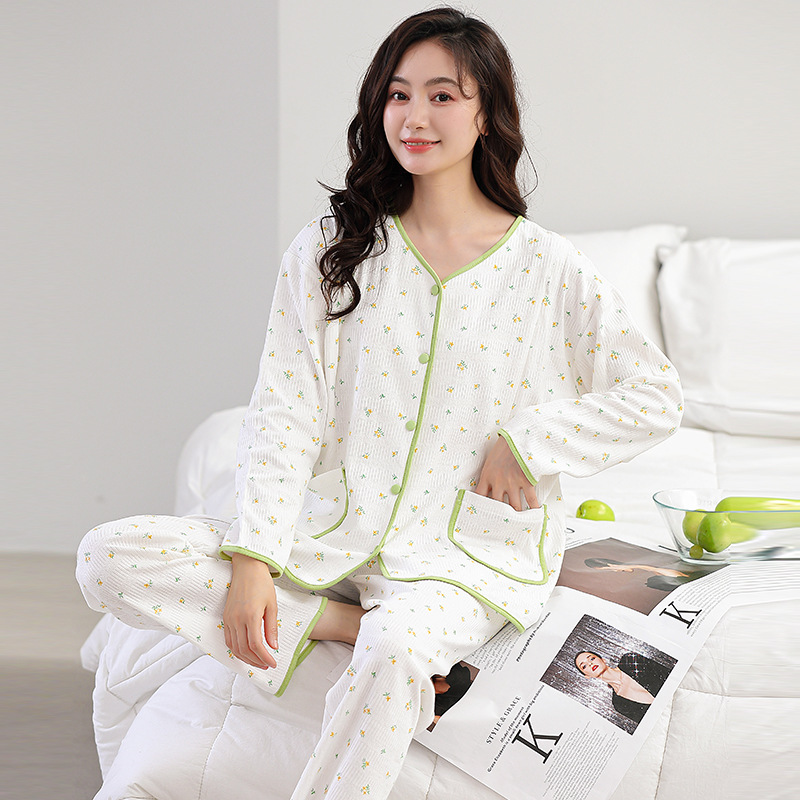 2024春4ワッフル胸パッド付き月子服産婦出産予定妊婦授乳パジャマ妊娠期間パジャマ女性5