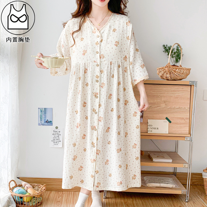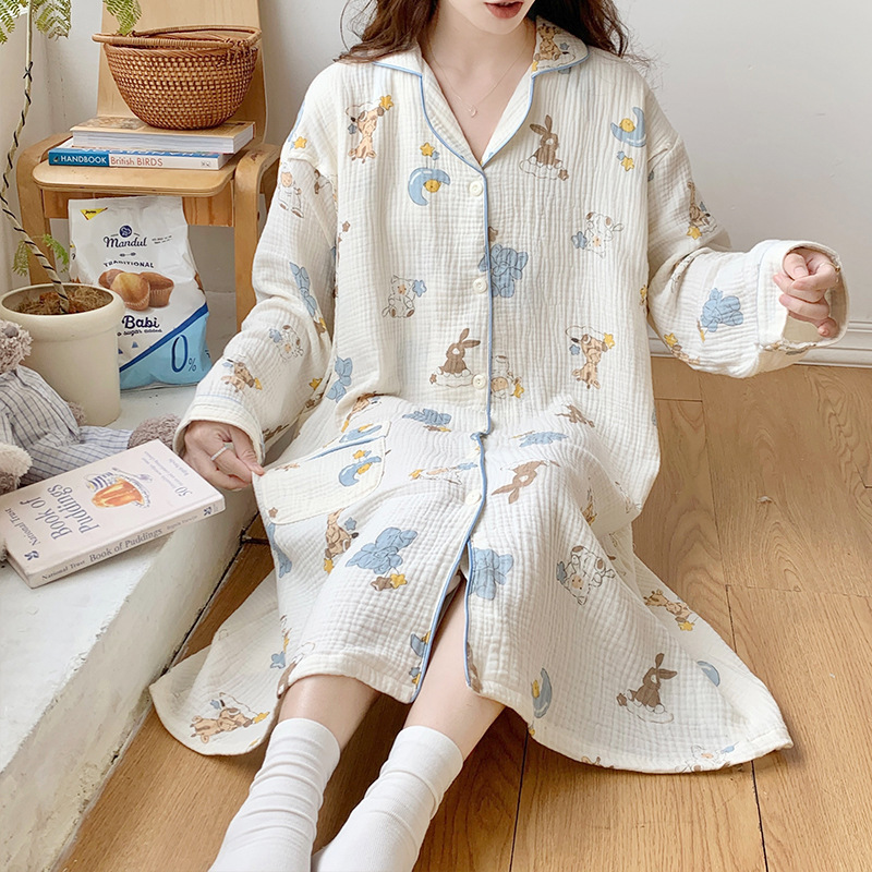 2024ガーゼ授乳スカート夏の薄い綿の妊娠期妊婦パジャマ長袖産婦授乳月子スカート