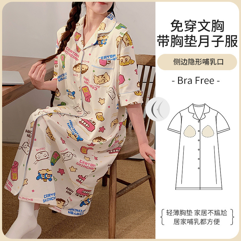 2024胸パッド付き半袖パジャマパジャマ夏ワッフル出産予定スカート出産後薄手授乳月子服