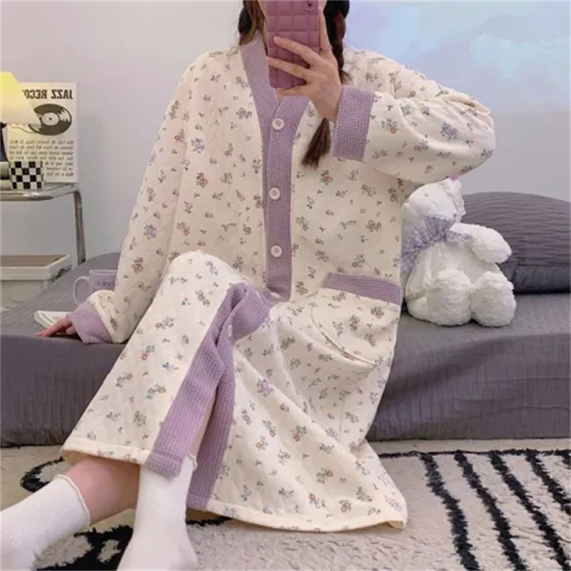 2024月子服秋冬産房授乳スカート積層厚産後空気綿妊婦パジャマワンピース