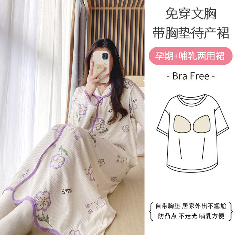 2024月子服春の3綿の長袖の授乳のスカートは胸のパッドが付いています。