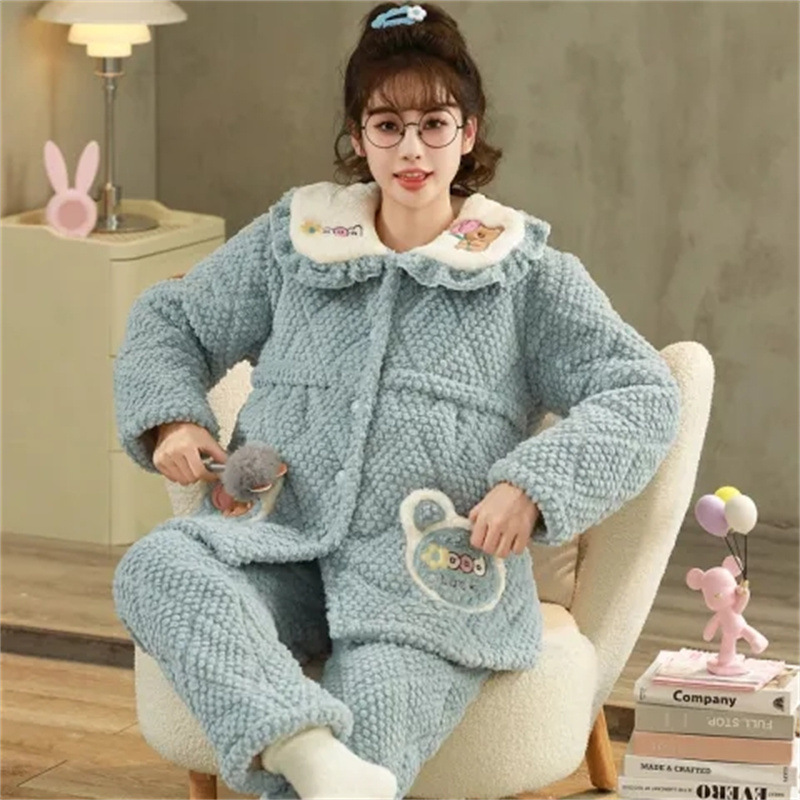 2024月子服三層綿入り妊婦パジャマ12月秋冬大サイズコーラルフリース授乳後