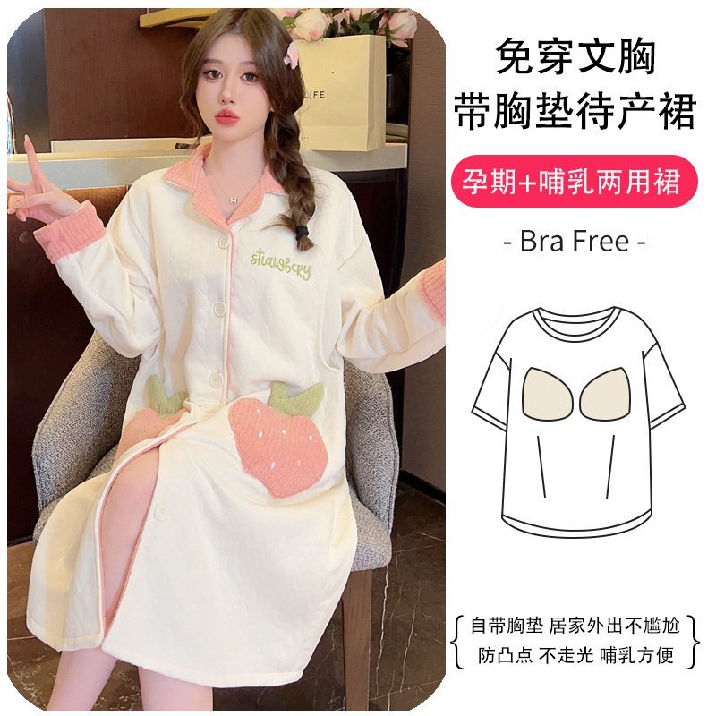 2024妊婦のパジャマスカート秋空気綿産後授乳胸パッド付き月子服出産前後の厚い出産待ち部屋の授乳スカート