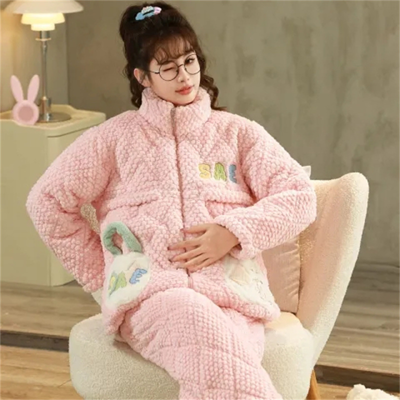 2024月子服三層綿を挟んだ妊婦は12月の冬の大きいサイズのサンゴの綿毛と厚い綿毛の哺乳パジャマで外出できます。