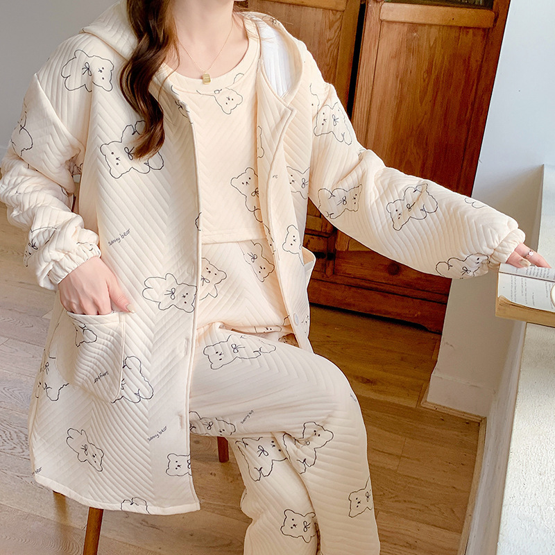2024空気綿月子服三点セット秋冬12出産前産後保温フード付き哺乳妊婦パジャマ女性11