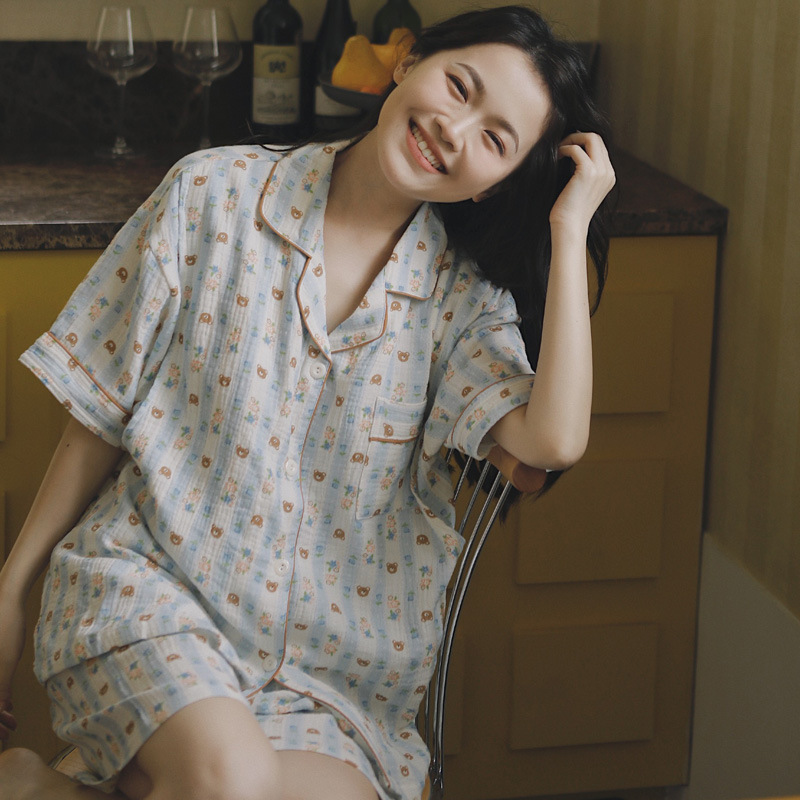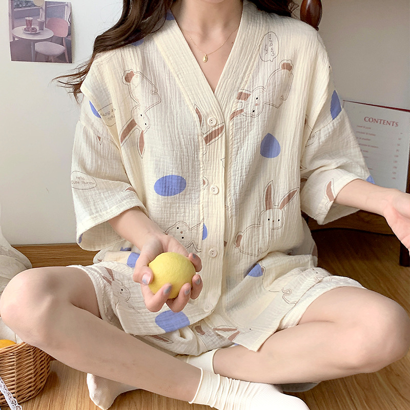 2024純綿夏半袖縮みガーゼ月子服二重妊婦パジャマ哺乳セット産後授乳服
