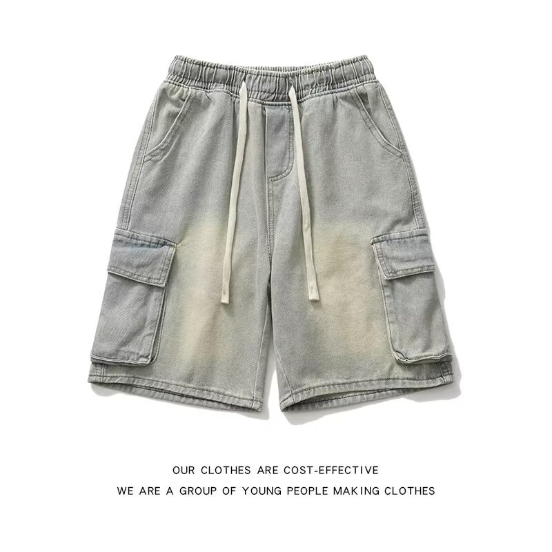 アメリカのデニムの半ズボンの男性の夏の薄い金のゆったりしているストレートの5分のズボンの男性はカジュアルな外に合わせて工装の中のズボンを着ます。