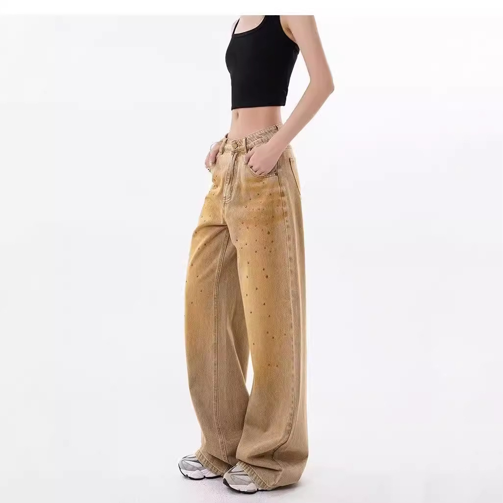 レトロにして古いリベットのワイドパンツのジーンズの女性秋冬のデザイン感がゆったりしています。