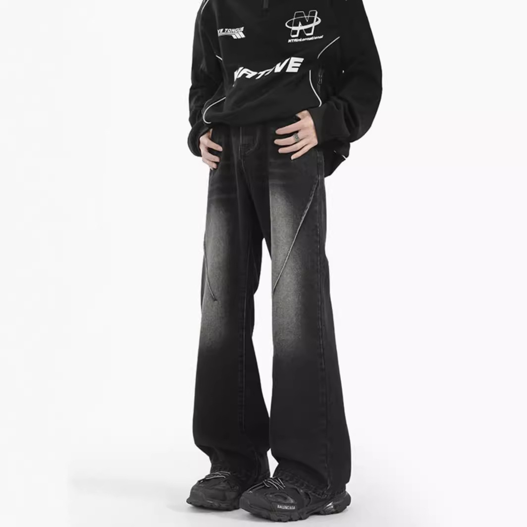 メンズ春秋ストレートワイドパンツ、トレンドブランド、ストリート系パンツ、アメリカンレトロ、ヘビーウォッシュデニム、ストレート、着痩せ効果