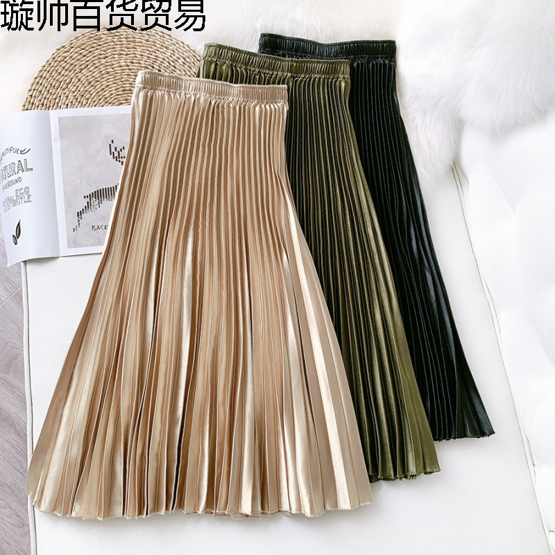 AliExpress クロスボーダーハイウエストサテンメタリックプリーツスカート春と夏の女性のレトロミッドレングススリム A ラインスカート