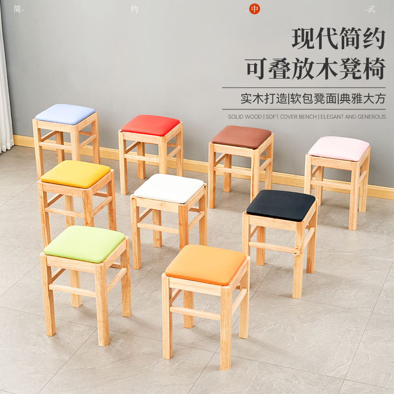 新しい無垢材の家庭用スツール、モダンでシンプルな積み重ね可能な木製スツールと椅子、レストラン用のソフトパッケージの正方形のスツール卸売