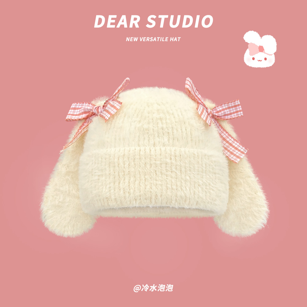 日本の甘い蝶結びのウサギの耳のぬいぐるみのニット帽の子供の秋冬のベルベットの保温のかわいい耳の帽子