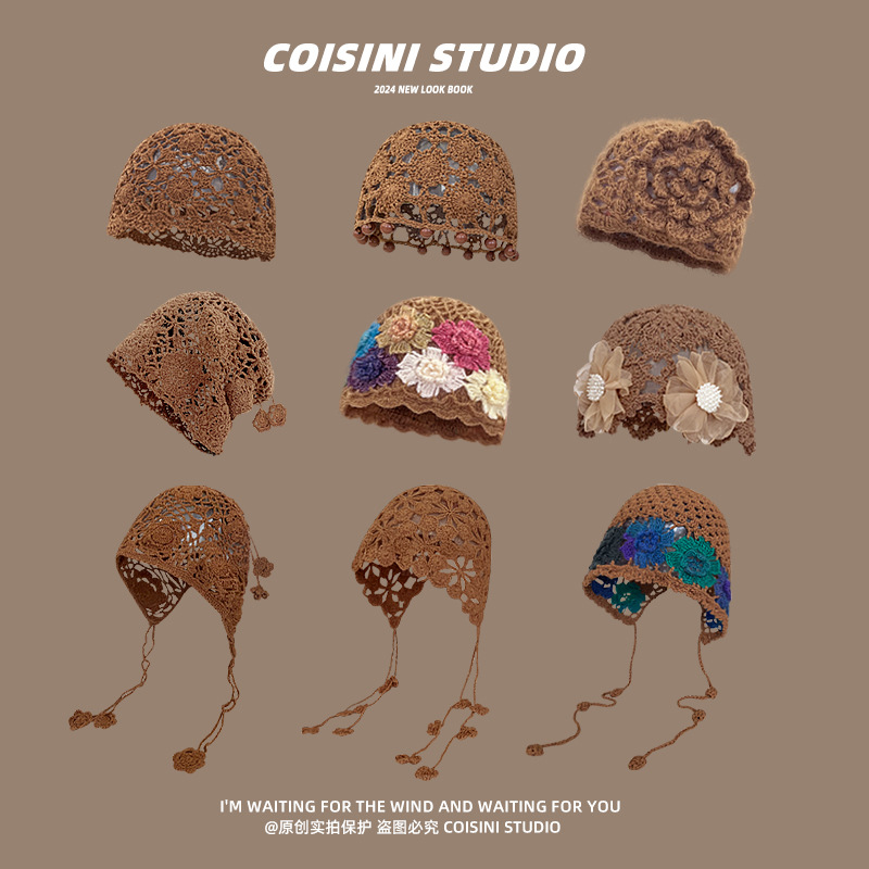 ボヘミアンの手作りニットの包頭帽子女性民族風旅行写真の透かし彫りの帽子